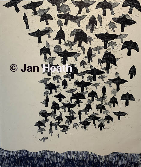 Flock Flying woodcut $175. 24x20 mounted size Sold